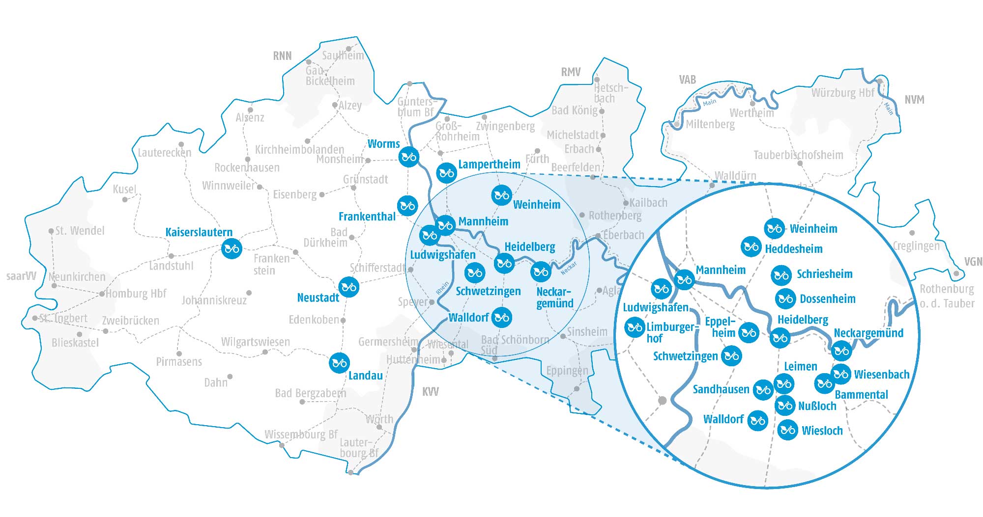 VRNnextbike ist das Fahrradvermietsystem im VRN. Es ist eine praktische und günstige Ergänzung zu Bus und Bahn. Das Beste daran: Die Mietstationen sind immer in der Nähe von Haltestellen platziert, so dass die Angebote optimal miteinander kombiniert werden können. VRNnextbike ist bereits in vielen Städten im VRN verfügbar und kann städteübergreifend genutzt werden. Jährlich kommen neue Standorte hinzu.